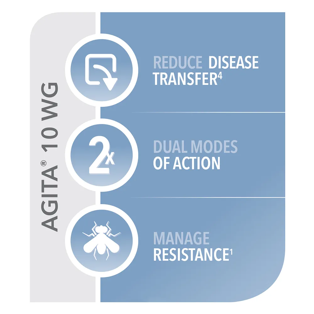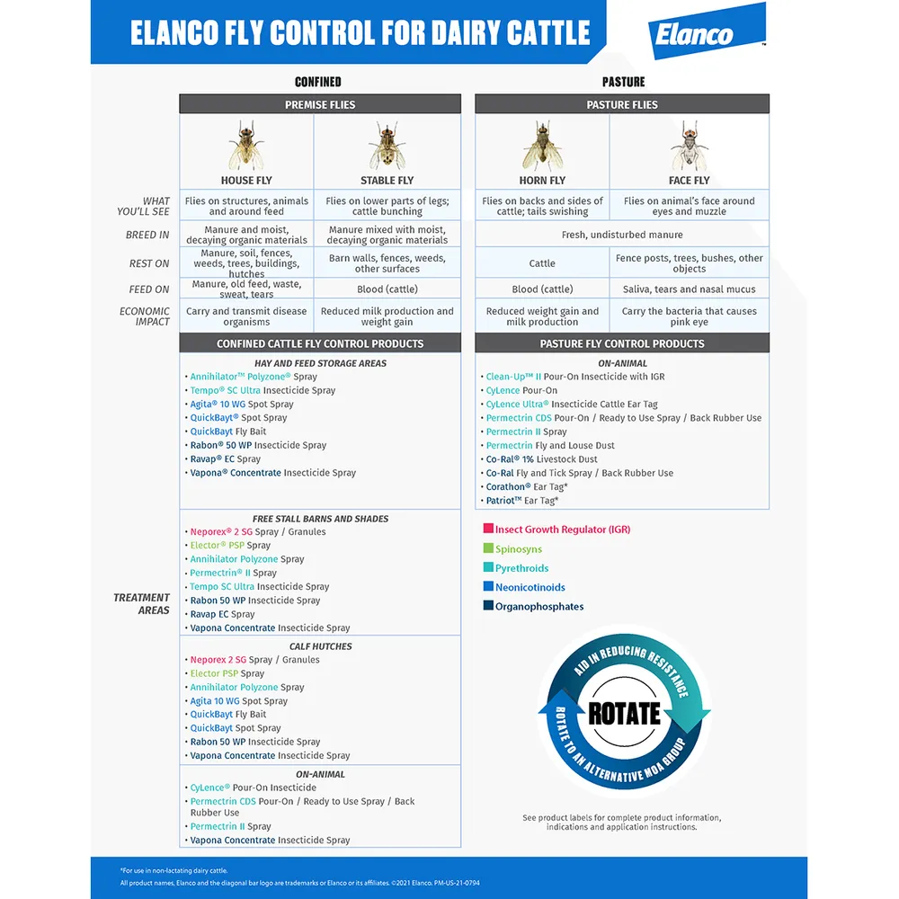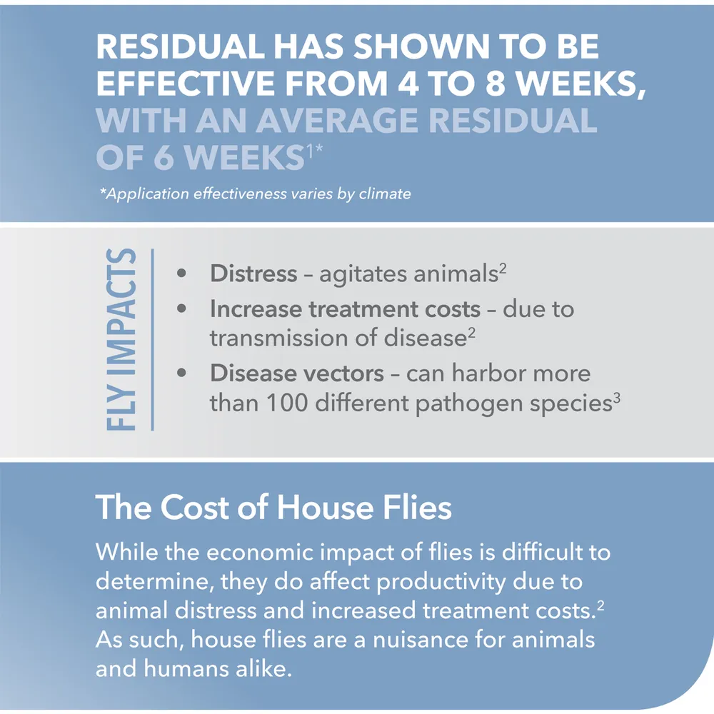 Directions: Use as part of an integrated pest management program for house flies. For application as a spot spray insecticidal bait. Use suspension on day of mixing, preferably immediately after preparation. Mix quantity indicated on label in corresponding volume of lukewarm water. Apply using standard liquid spray applicator to approximately 1/3 of total intended surface area to be treated, stirring occasionally. Surfaces on which flies are particularly likely to settle should be sprayed. Re-agitate before use if spraying is interrupted for longer than 30 minutes. See label for additional information and for instructions for litter beetle control in broiler houses. Apply only in locations not accessible to children, pets, domestic animals or wildlife. Protect from direct sunlight, water and rainfall. Do not apply directly to livestock or livestock feed. For commercial animal housing facilities only. Do not allow product to contact plants in bloom if bees are foraging in treatment area.