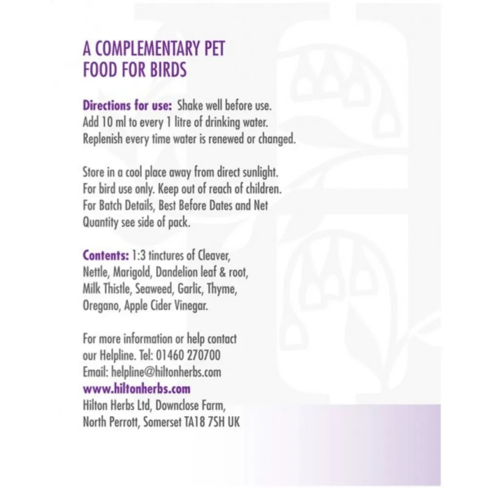 Balanced blend of herbal tinctures mixed with apple cider vinegar. Formulated to maintain and support a variety of bird and poultry issues including overall general health and vitality, resistance to parasites, egg quality and production, efficient digestive system, superb feather and skin condition, depth of feather pigmentation, efficient circulation, healthy nervous system, effective liver and kidney function, and efficient respiratory system. Â