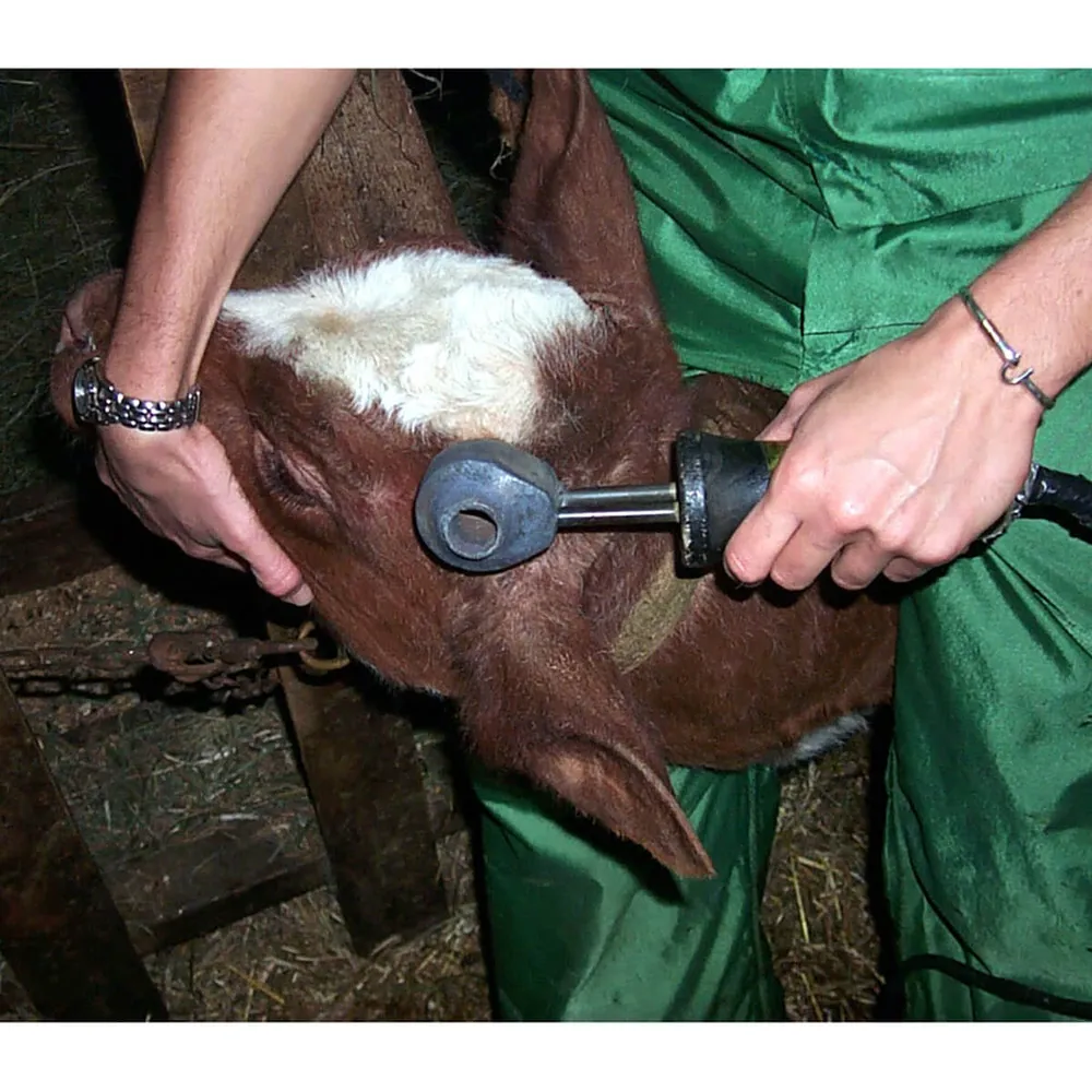 Saves time – one instrument handles newborns 3-10 days old; flip it over for larger calves up to 12 weeks (some breeds up to 6 months). Solid brass heating element has long life and stays hotter longer. Inside diameters – 3/4″ and 1″. 110V, 450W.