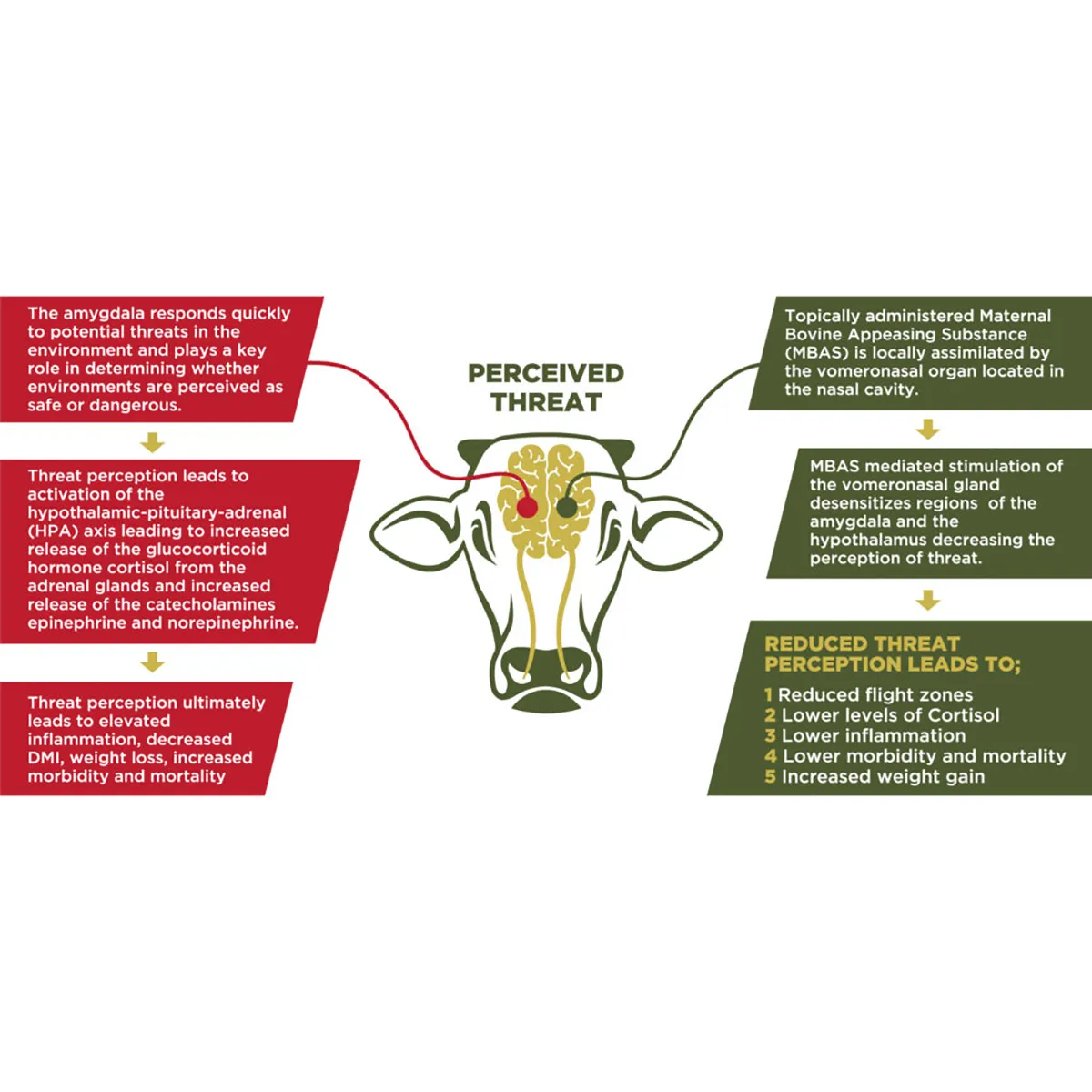 The first and only technology that mitigates stress and its negative effects in cattle of all ages. Gives calves the comfort of being with mom. Each ml contains 100 mg of the maternal bovine appeasing substance (MBAS), a natural secretion produced by nursing cows that decreases threat perception and provides a sense of comfort to calves.