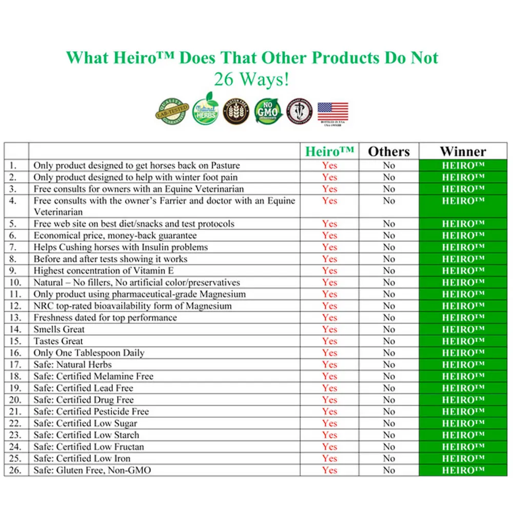 All-natural HEIRO was developed by Dr. Frank Reilly, DVM, to help the rapidly growing number of horses suffering from chronic sore feet with high insulin levels. From spring’s new grass and summer’s heat to the frosty grass and frozen ground of winter, seasonal factors can cause serious laminar injury and chronic foot pain. Fortunately, after two years and hundreds of insulin tests, Dr. Reilly discovered the right combination and concentration of organicals to help improve insulin control and get your horse back on the pasture where they were born to graze and play. No more dirt lot. Get your horse back to grass pasture faster with HEIRO. Try risk-free today!