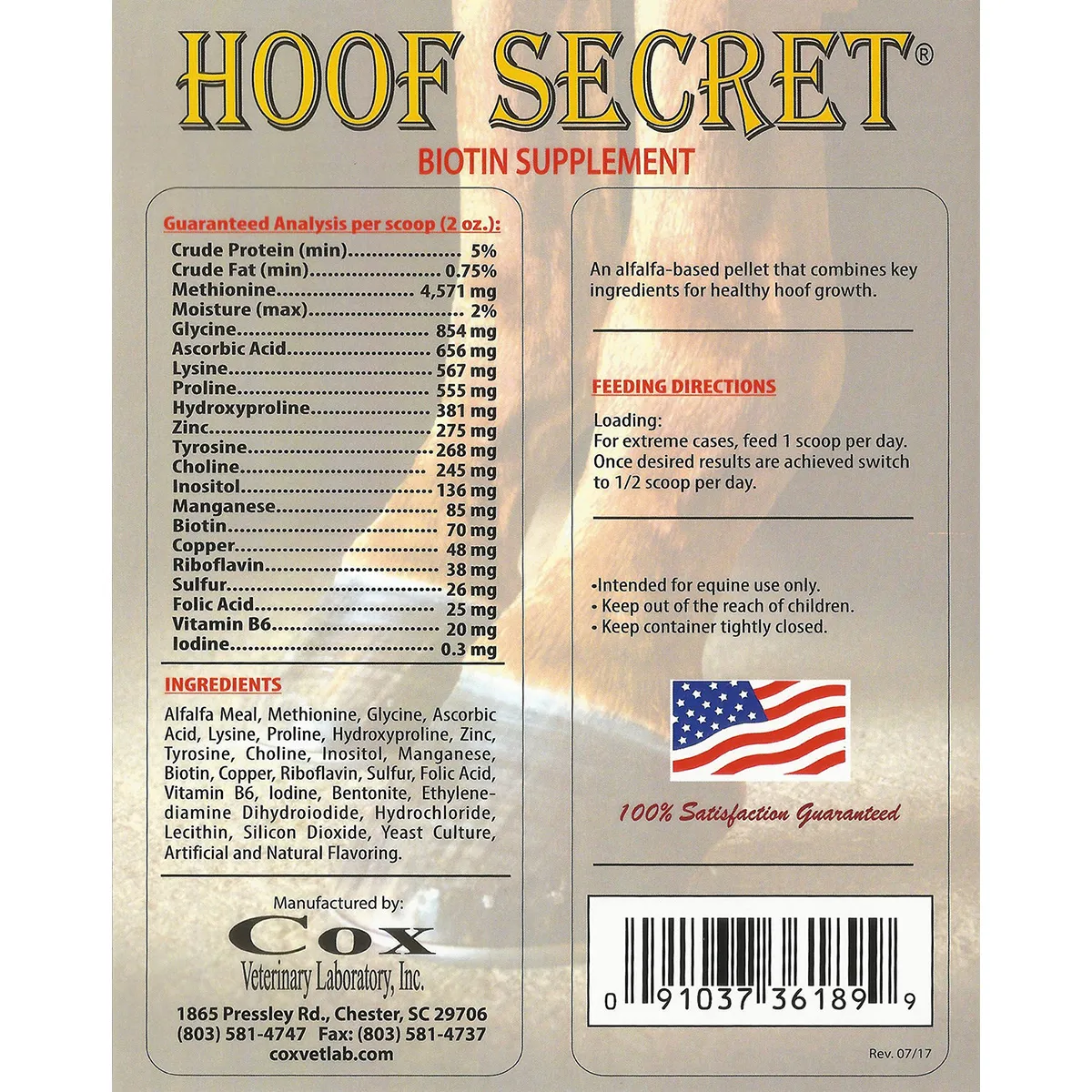 Each scoop contains min 5% crude protein, min 0.75% crude fat, 70 mg biotin, alfalfa meal, yeast culture, lecithin and more.