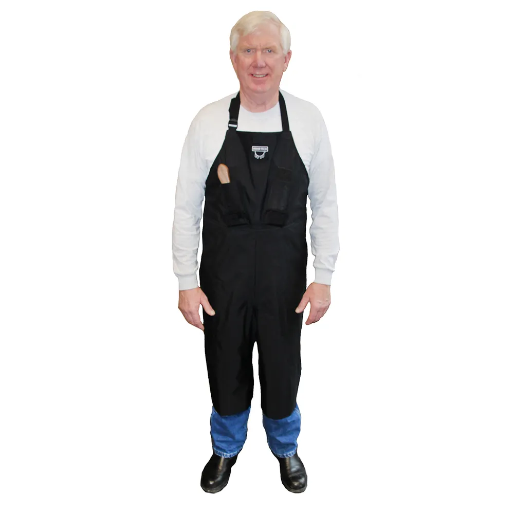 Apron with Chaps – Waterproof nylon apron gives full front coverage. Chest pockets for knives and have an opening at the bottom to empty hoof chips. One size fits all with adjustable neck strap, waist straps and leg straps. Machine wash and dry. Measures 45″Lx33.5″W.