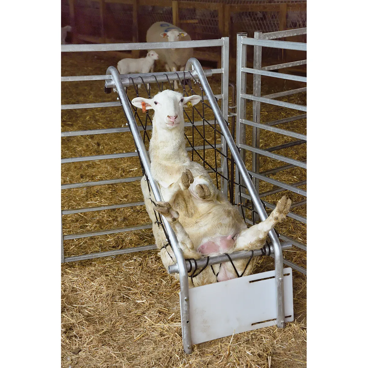 Holds sheep reliably in a relaxed position while allowing the use of both hands to trim feet, tag ears, examine and medicate. Adjustable width for all sizes. Galvanized steel pipe with elastic webbing. Includes support rope for large/heavy sheep, prevents elastic webbing from over-stretching. 40″L, minimum width 10″, maximum width 16″, bottom “legs” 14″. Folds flat for easy storage and transporting with some disassembly. Not for use with horned animals. Horns may become entangled with webbing.