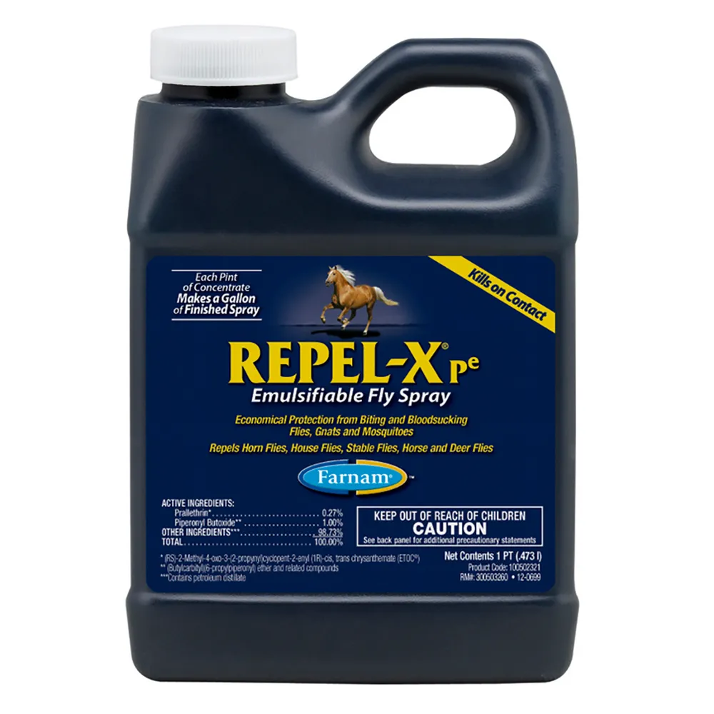 Emulsifiable fly spray to be mixed with water for direct application to horses and ponies. Provides protection from biting and bloodsucking flies, gnats and mosquitoes; repels horn, stable, horse, house and deer flies.