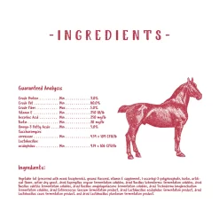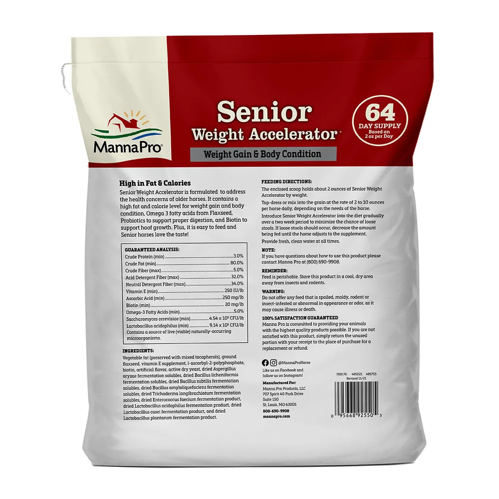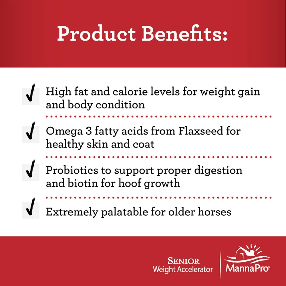Weight gain supplement designed for the special health needs of senior horses and provides essential calories needed for weight gain and overall body condition, plus omega-3s, probiotics and essential vitamins. Addresses health concerns in older horses such as: high fat and calorie levels for weight gain and body condition; omega-3 fatty acids from flaxseed for healthy skin and coat; probiotics to support proper digestion, essential vitamins and antioxidants for immune support, and biotin to support hoof growth. Plus it is easy to feed and senior horses love the taste!